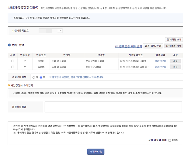 저는 해외구매대행을 부업종으로 추가하기 위해 사업자등록 정정 신청을 했습니다.