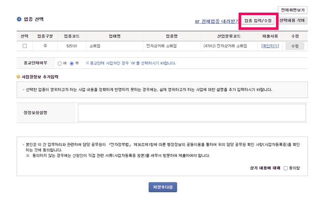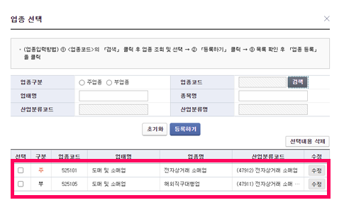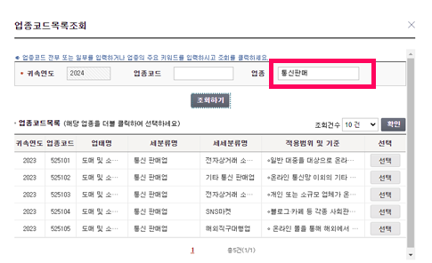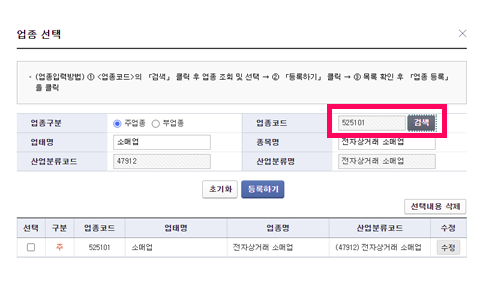 인터넷 판매의 경우 업종에 '통신판매'라고 검색 후 나오는 업종을 확인 후 수정이나 추가를 원하는 업종을 선택해 주세요.