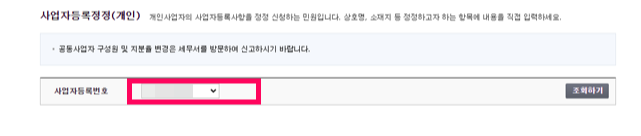 사업자등록 정정을 원하는 사업자등록번호를 확인 후 정정 사항을 선택해 주세요.