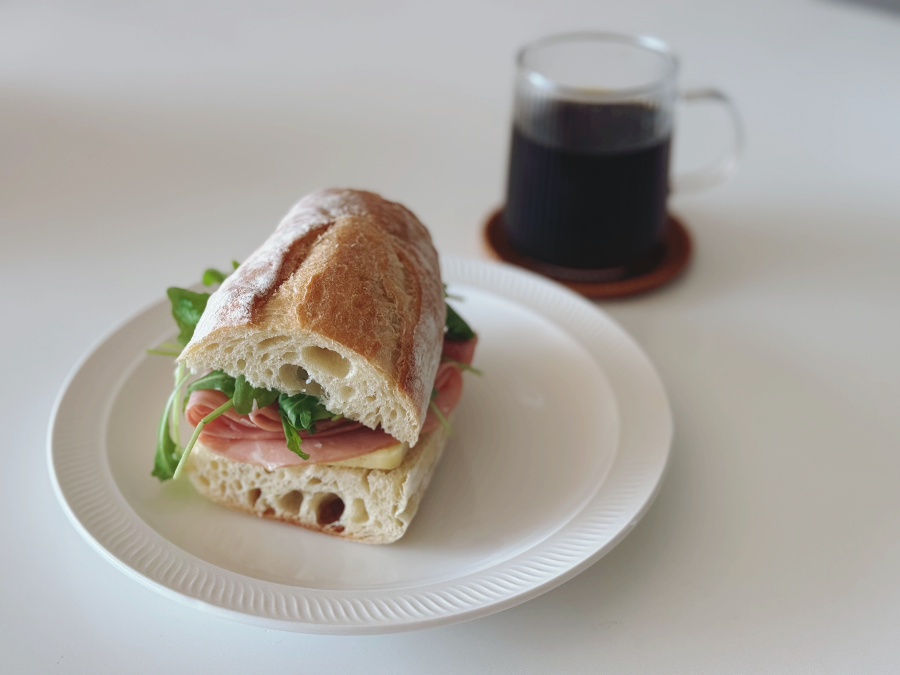 잠봉뵈르는 프랑스어로 햄과 버터인데요. 바게트에 햄과 버터를 넣어 만든 샌드위치입니다. 진짜 바게트 빵에 햄과 버터만 넣으면 끝이랍니다. 루꼴라는 제가 좋아해서 같이 넣어줬답니다.