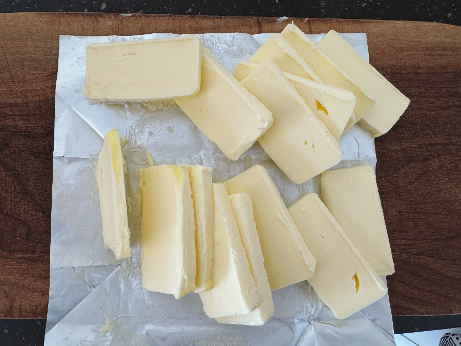 여기서 잠깐! 덩어리 버터는 먹기 좋게 잘라서 넣어두면 편하답니다. 버터를 적당한 크기로 자르고 종이호일에 싸서 밀폐 용기에 넣어두고 사용하면 하나씩 꺼내서 먹기 좋습니다. 초록색 반찬통은 친구가 선물해 준 건데 색상은 촌스럽지만 내용물이 신선하게 오래간답니다.