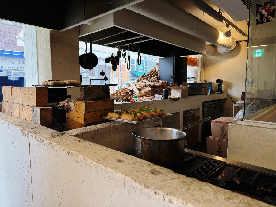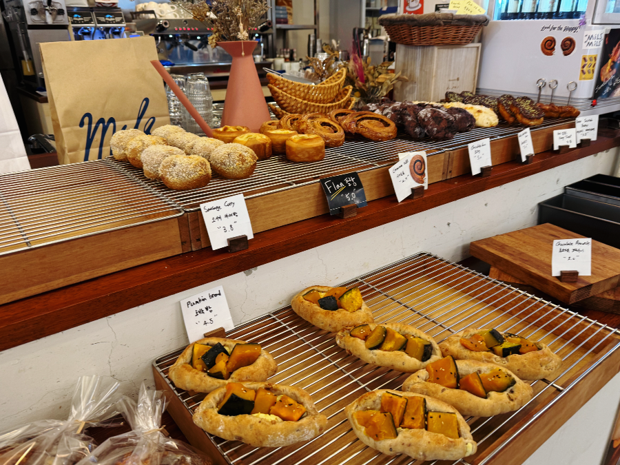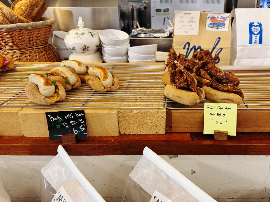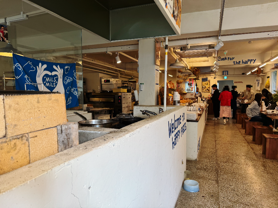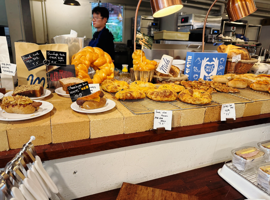 오픈되어 있는 주방이 테이블 공간보다 더 넓어서 그런지 밀스 내부는 생각보다 작게 느껴졌는데요. 빵 진열대와 주방이 한쪽에 있고 반대쪽 벽 한쪽에 테이블이 배치되어 있습니다. 평일 12시쯤 방문했는데 저희 다음 팀을 끝으로 테이블이 꽉 찼습니다. 조금 늦었으면 웨이팅 할 뻔했답니다~
