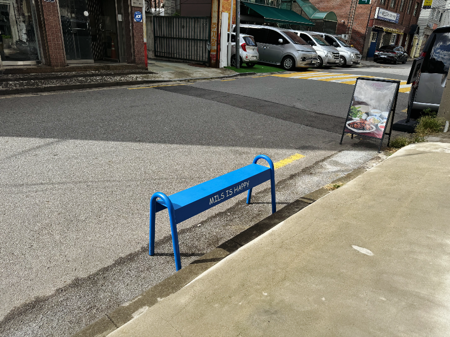 카페 밀스는 2호선 성수역과 수인분당선 서울숲역 두 곳에서 갈 수 있는데요. 역에서 걸어서 12-15분 정도 걸리는 곳에 있습니다. 친구와 만나 서울숲역에서 내려서 걸어갔는데 12분 정도 걸렸답니다. 주택가와 작은 공장들이 있는 골목에 카페가 있어 주차는 불가능할 것 같아 보였습니다. 카페는 주택을 개조해서 만든 곳 같았는데요. 하얀 캐노피와 흰색으로 페인팅된 건물이 멀리서도 잘 보인답니다. 무심하게 놓여있지만 느낌 있는 나무 간판과 귀여운 파란 의자가 놓여있는 곳이 카페 밀스입니다~