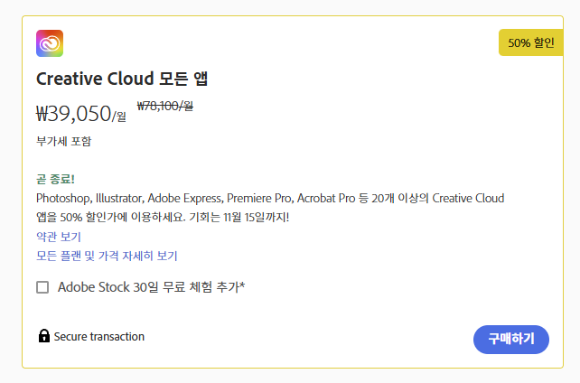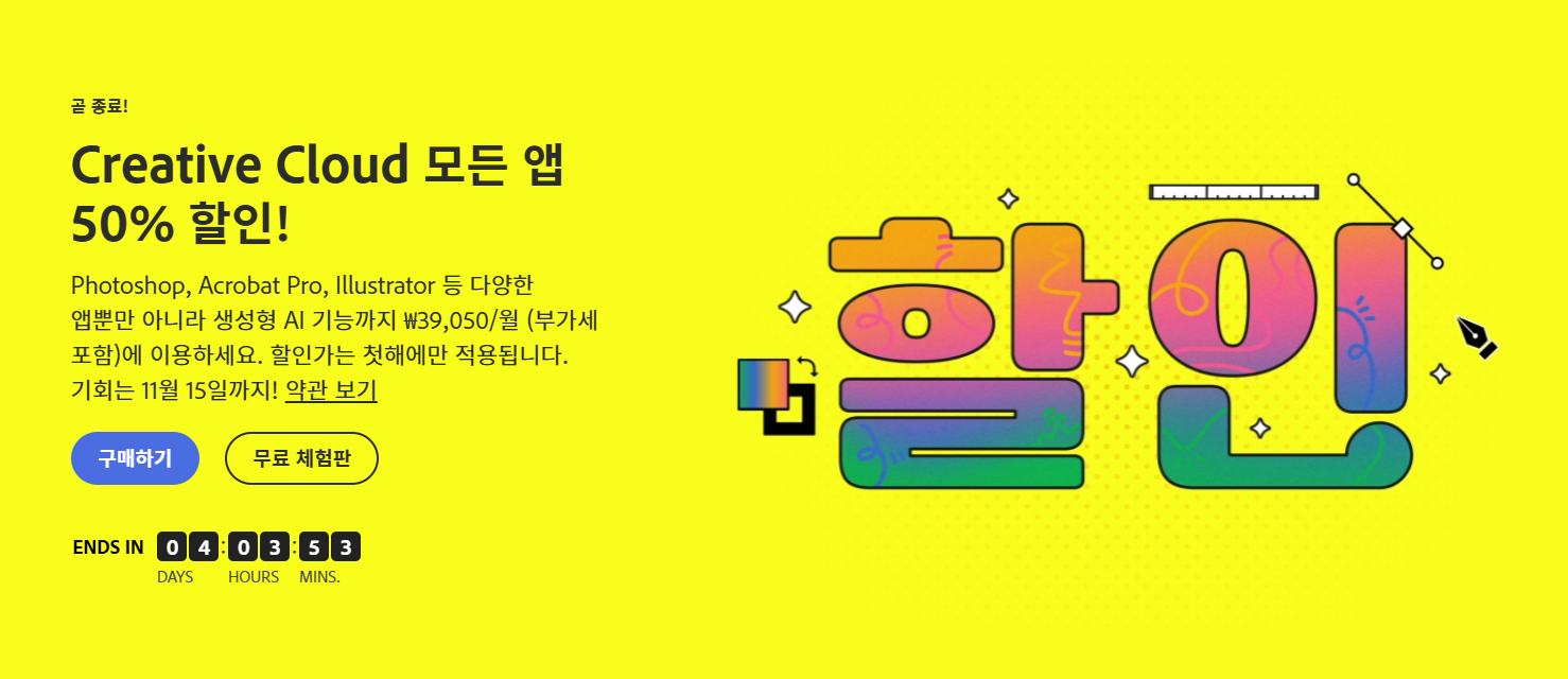 매년 11월 이맘때쯤 어도비는 요금 할인 이벤트를 하는데요. 올 해도 어도비 공식사이트에서 11월 15일까지 모든 프로그램을 할인하고 있습니다. 저도 항상 이맘때쯤 할인된 가격으로 결제해서 이용 중입니다. 포토샵, 아크로뱃, 일러스트레이터, 프리미어프로, 애프터이펙트까지 다양한 프로그램이 어도비 프로그램입니다.