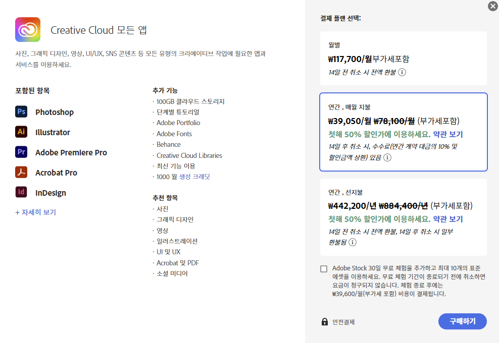 어도비의 모든 프로그램을 사용할 수 있는 플랜은 월 39,050원입니다. 달러 때문에 그런 건지 60% 할인요금이어서 그런 건지.. 작년엔 월 결제금액이 33,800원이었는데 올해는 50% 할인된 금액이 39,050원입니다. 필요한 프로그램 하나만 결제도 가능한데요. 포토샵 하나 이용 가격이 월 30,800원입니다. 50% 이벤트 할 때 결제하게 되는 이유인데요. 띠요용~~ 각각 구매하는 비용이 더 비싸답니다.