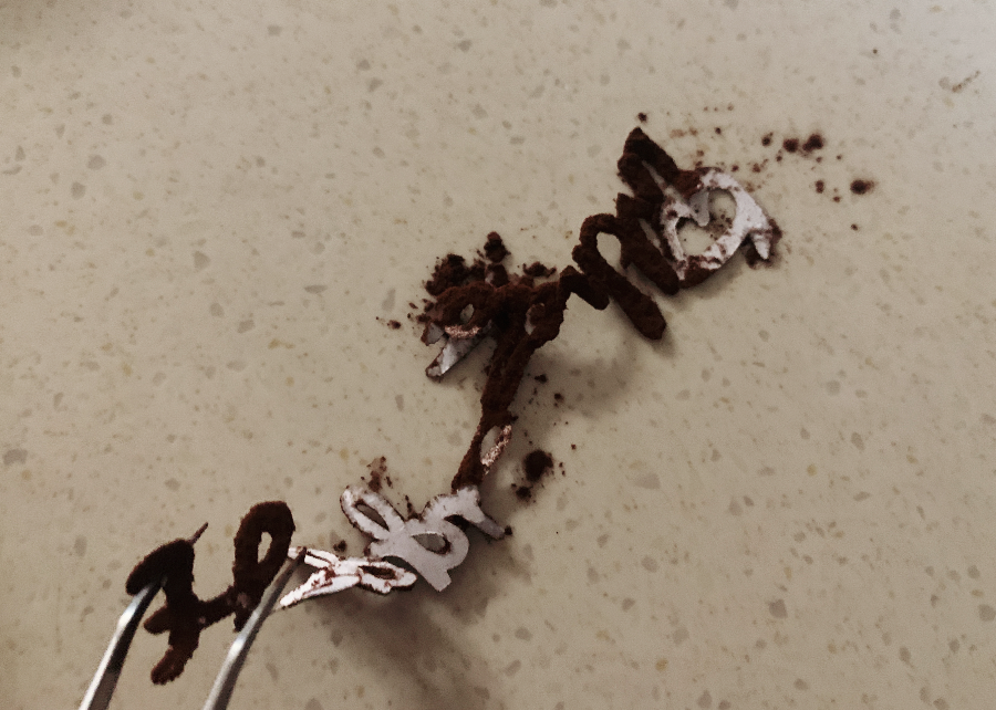 초콜릿파우더를 뿌리기 전 크림 위에 종이로 만든 문구를 올려놓고 뿌려서 이렇게 만들 수도 있답니다. 똥손이라 글씨가 살짝 찌그러졌지만 그래도 무슨 글씨인지 아시겠쥬?