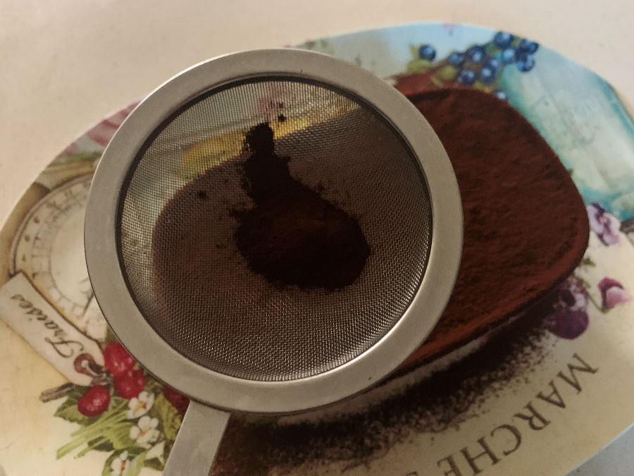 초콜릿 파우더는 티라미수를 먹기 전 위에 뿌려주면 됩니다. 고운 체를 이용해 초콜릿 파우더를 크림 위에 살살살 뿌려주세요.