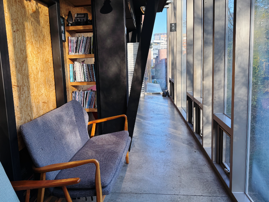 경희궁 뒤쪽 골목을 따라 조금 걸어가면 작은 언덕 위에 복합문화공간 에무 건물이 있습니다. 에무에는 스튜디오, 공연장, 북카페 겸 펍, 영화관, 루프탑이 있는데요. 작지만 여러 공간들이 꼭꼭 숨겨져 있습니다.