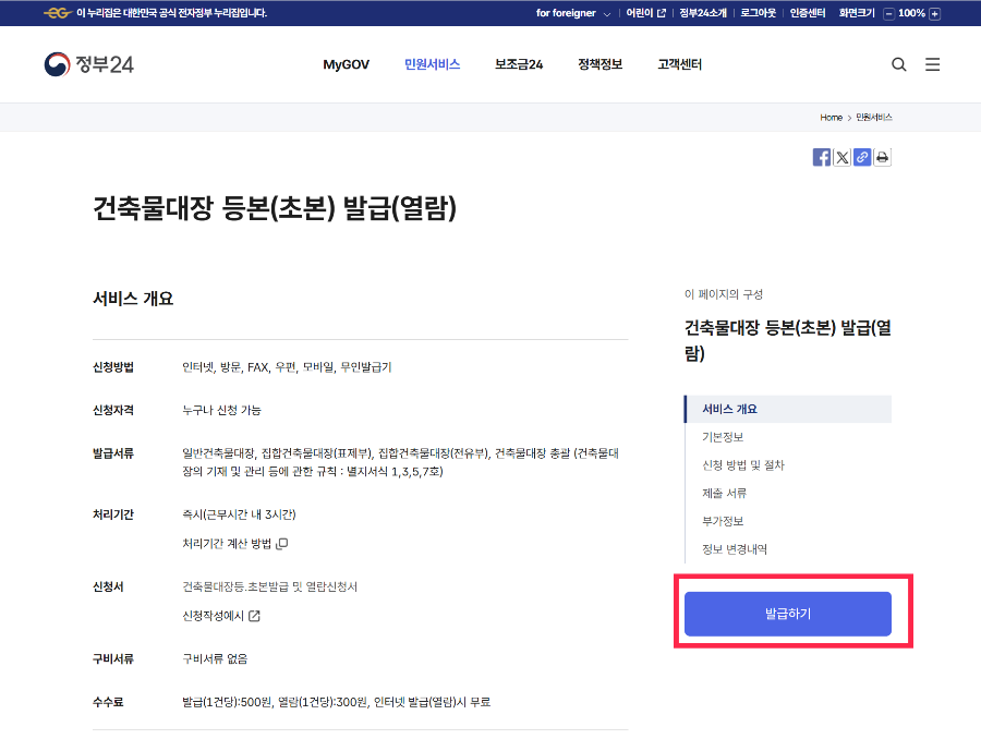 건축물대장 등본 발급 서비스 설명페이지에서 오른쪽 발급하기 버튼을 클릭해 주세요.