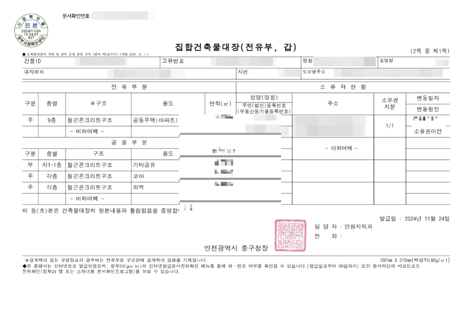 건축물대장 집합건물대장 전유부에는 이전등기할 물건의 면적, 소유자현황과 지분, 공시가격까지 자세한 정보가 나오기 때문에 건축물대장은 집합건물 전유부로 제출해야 하는 것 같습니다.
