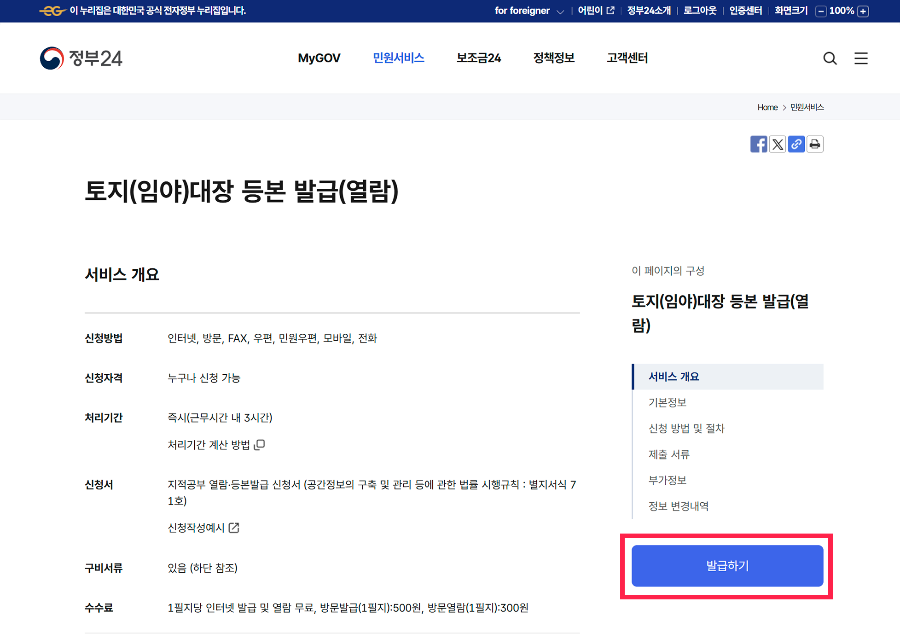 자주 찾는 서비스에서 토지(임야) 대장을 클릭하면 토지대장등본 발급 서비스 설명페이지로 이동합니다. 오른쪽 발급하기 버튼을 클릭해 주세요.