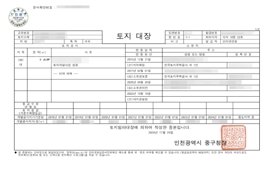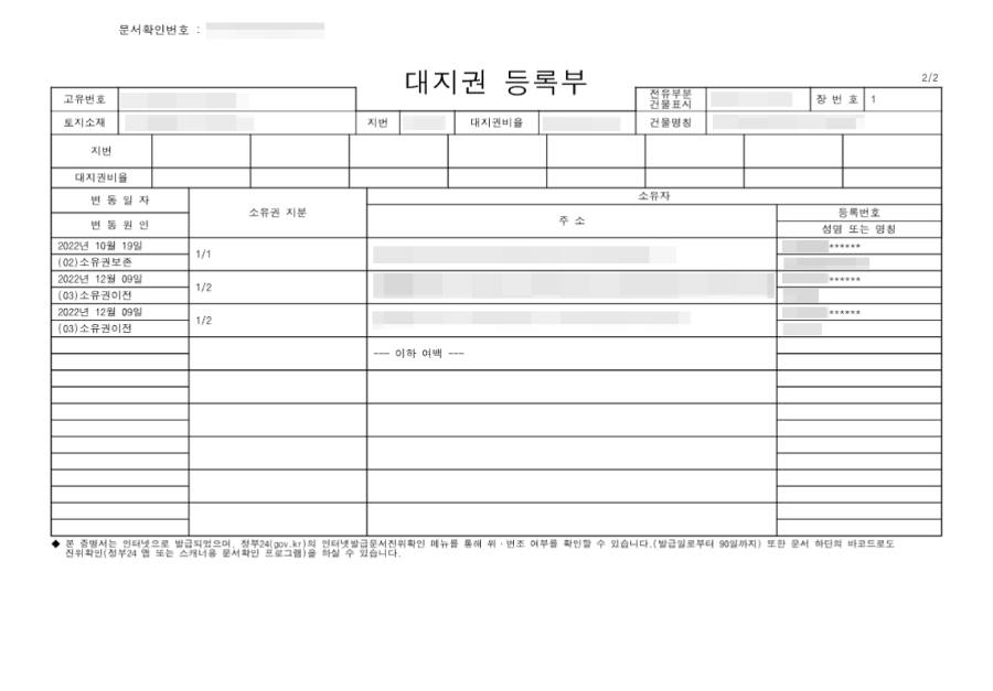 1. 토지대장 대지권등록부 발급 2. 건축물대장 집합건축물 전유부 발급 |