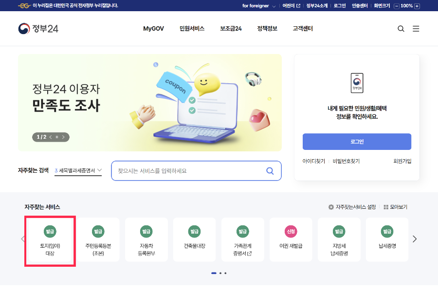메인화면 중간 부분 검색에서 토지대장을 검색하거나 자주 찾는 서비스에서 토지(임야) 대장을 클릭해 주세요.