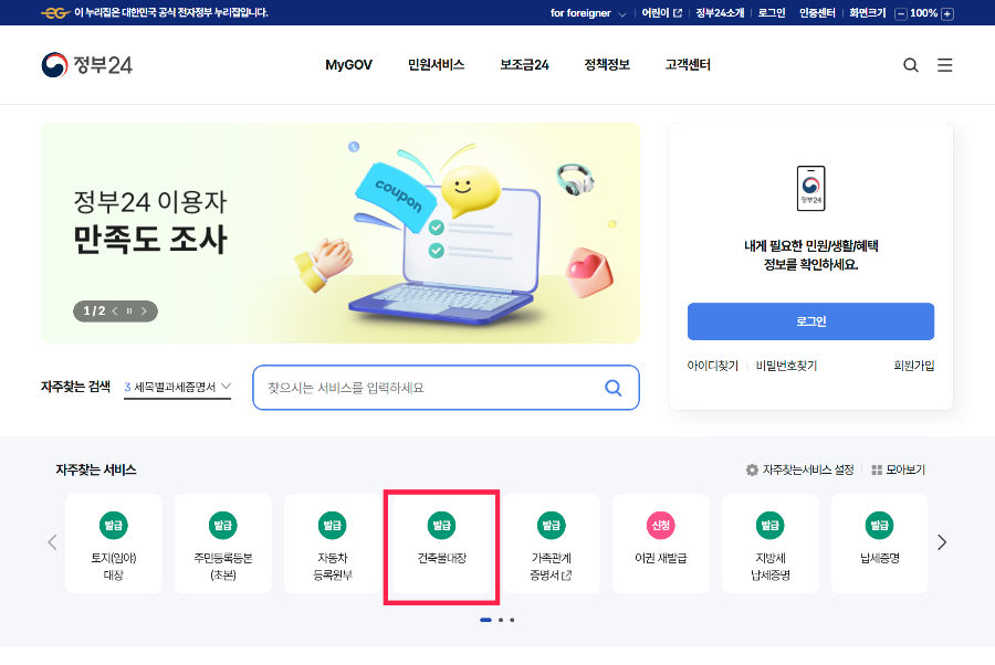 메인화면 중간 부분 검색에서 건축물대장을 검색하거나 자주 찾는 서비스에서 건축물대장을 클릭해 주세요.