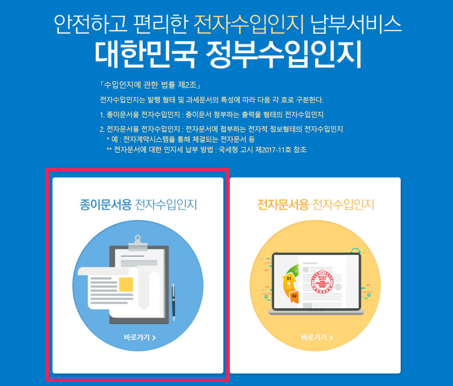 사이트에 접속하면 용도에 따라 종이문서용과 전자문서용 수입인지가 구분되어 있습니다. 등기소에 프린트한 서류들을 제출해야 하기 때문에 종이문서용 전자수입인지를 클릭해 주세요.