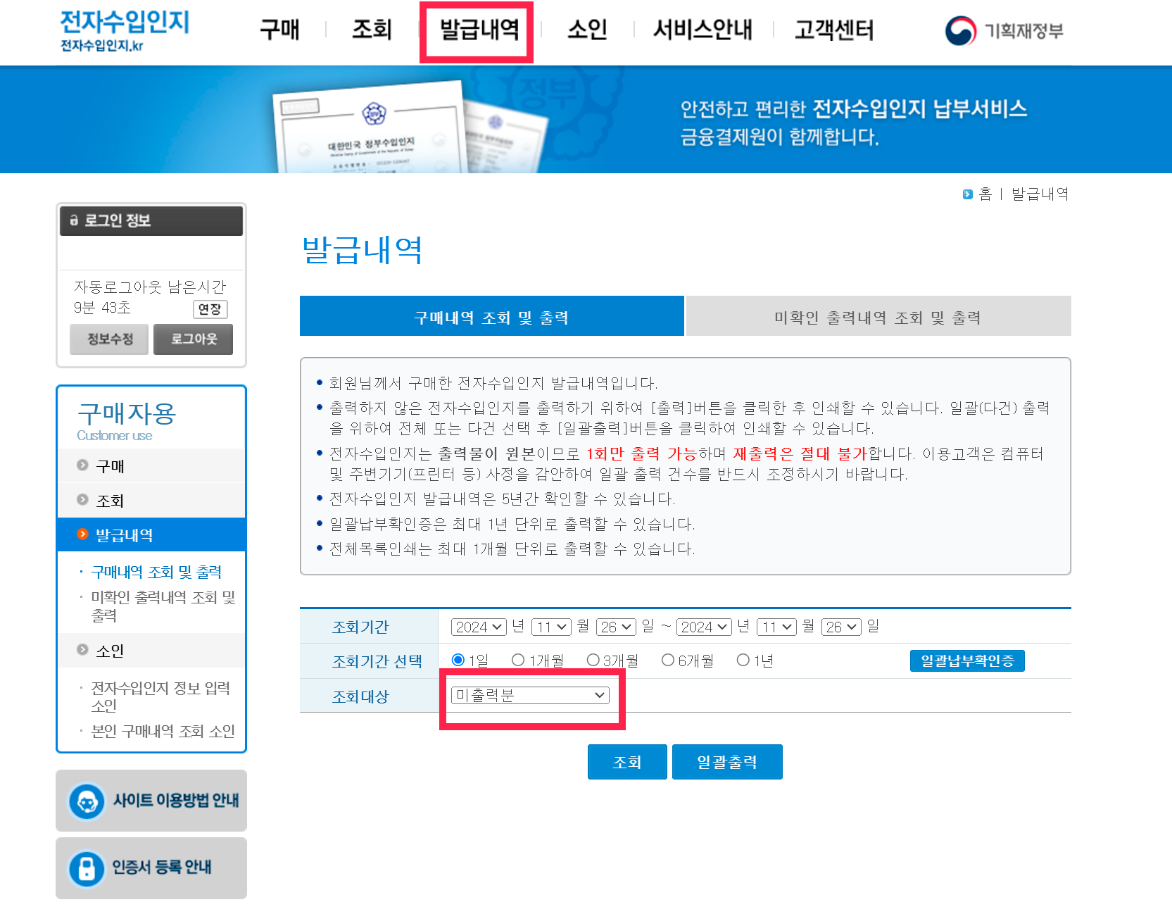 상단 메뉴 중 발급내역에 가서 미출력분을 조회해서 프린트해 주세요.