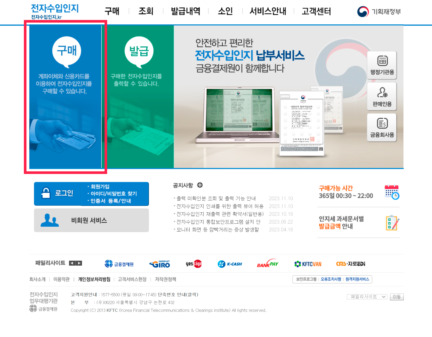 종이문서용 전자수입인지 배너를 클릭하면 수입인지를 구매할 수 있는 사이트로 이동합니다. 회원가입을 하고 로그인을 한 후 구매메뉴를 클릭해 주세요.