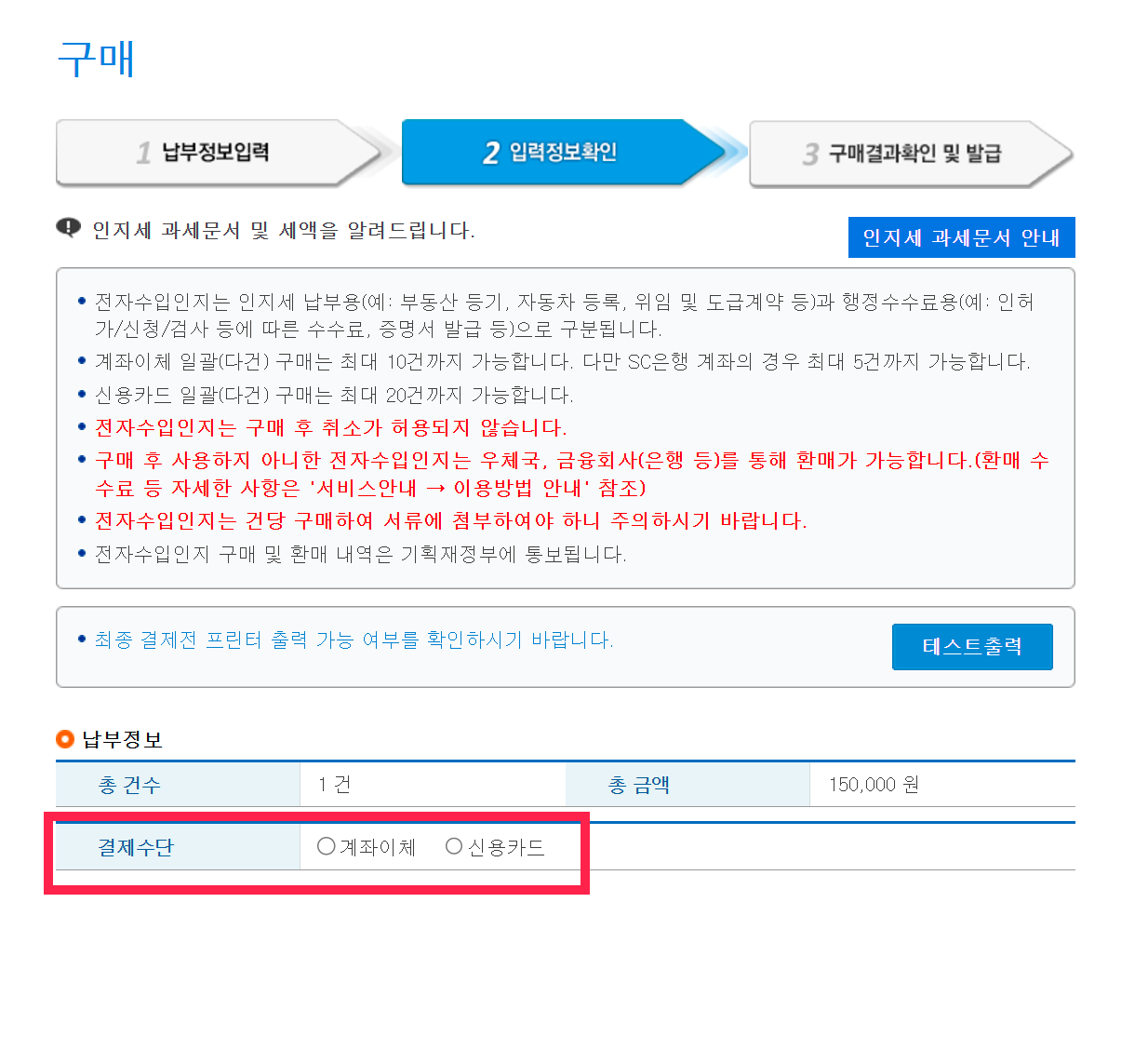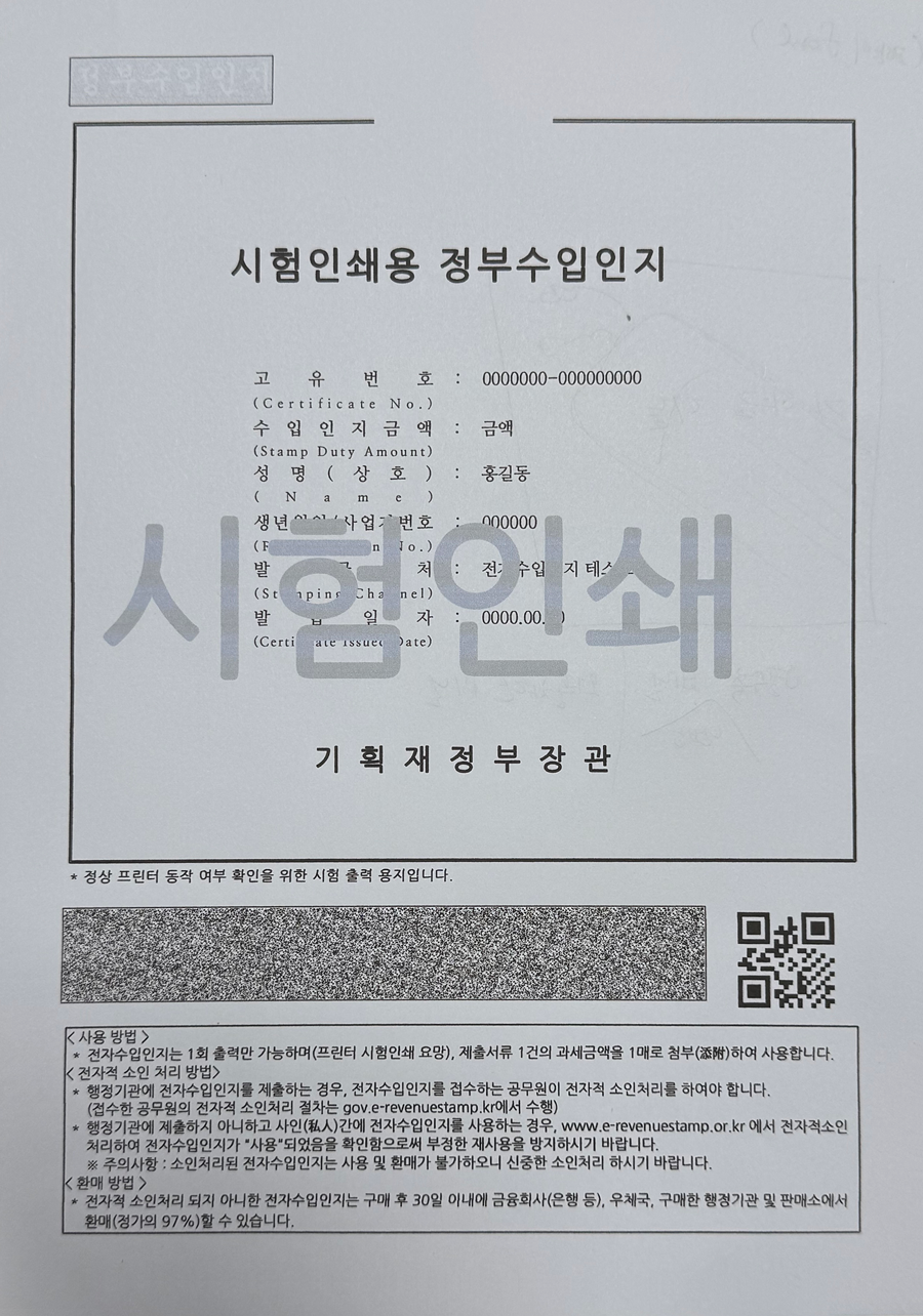 정부수입인지를 프린트할 때 주의사항이 있습니다. 프린트하기 전 꼭 테스트 인쇄를 먼저 해주세요. 수입인지는 1회만 출력이 가능하고 재출력이 안되기 때문입니다. 출력되는 종이 한 장이 무려 150,000원이라는 사실.. 잊지 마세요~