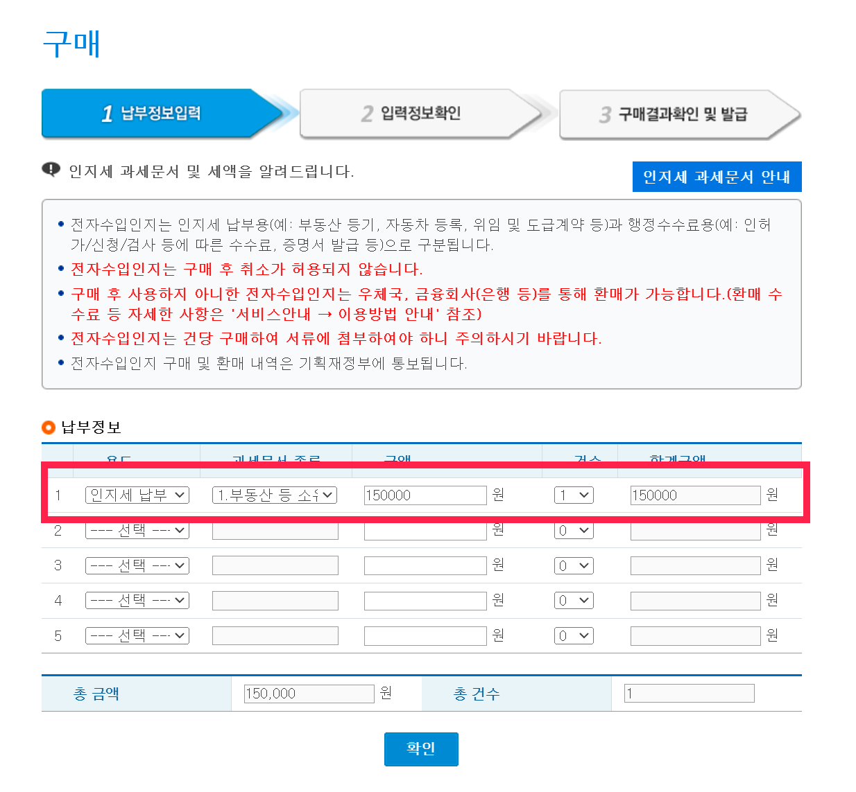 구매페이지에서 납부정보를 차례대로 입력합니다. 용도는 인지세납부, 과세문서 종류는 부동산 등 소유권 이전을 선택하고 금액을 기입합니다. 1억 원 초과 10억 원 이하인 경우 15만 원이고 10억 원 초과하는 경우 35만 원을 기입하면 됩니다.