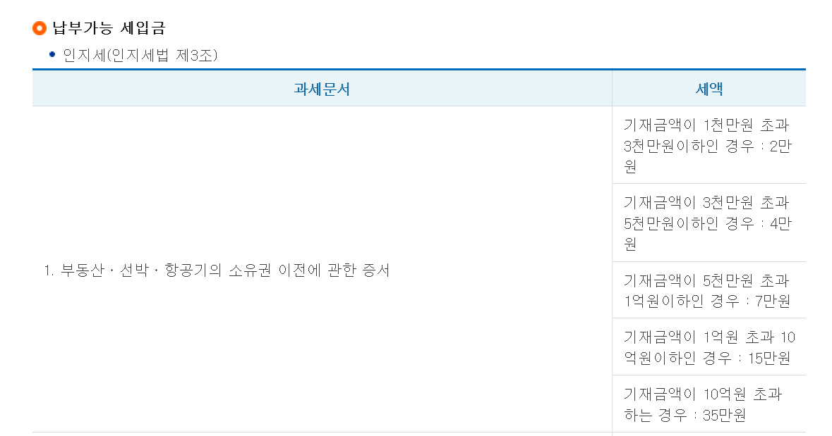 정부수입인지는 국고수입이 되는 세입금의 징수를 위하여 기획재정부가 발행하고 있는 인지입니다. 우표 같은 것이라고 생각하면 이해가 쉽습니다. 편지를 보낼 때 우표를 사서 편지봉투에 붙이는데요. 우표는 우편요금을 납부했다는 표시입니다. 정부수입인지도 세금을 납부했다는 걸 증명하는 종이입니다. 정부수입인지 가격은 부동산 소유권이전등기 증서 기재금액에 따라 다른데요. 10억 원 초과하는 경우 세액은 35만 원, 1억 원 초과 10억 원 이하인 경우 15만 원, 5천만 원 초과 1억 원 이하인 경우 7만 원, 3천만 원 초과 5천만 원 이하인 경우 4만 원, 1천만 원 초과 3천만 원 이하인 경우 2만 원입니다. 일반 주택의 경우 1억 원 이하는 인지세가 면세되어 내지 않아도 되지만 주택이 아닌 오피스텔, 상가는 1억 원 이하이더라도 인지세를 납부해야 합니다.