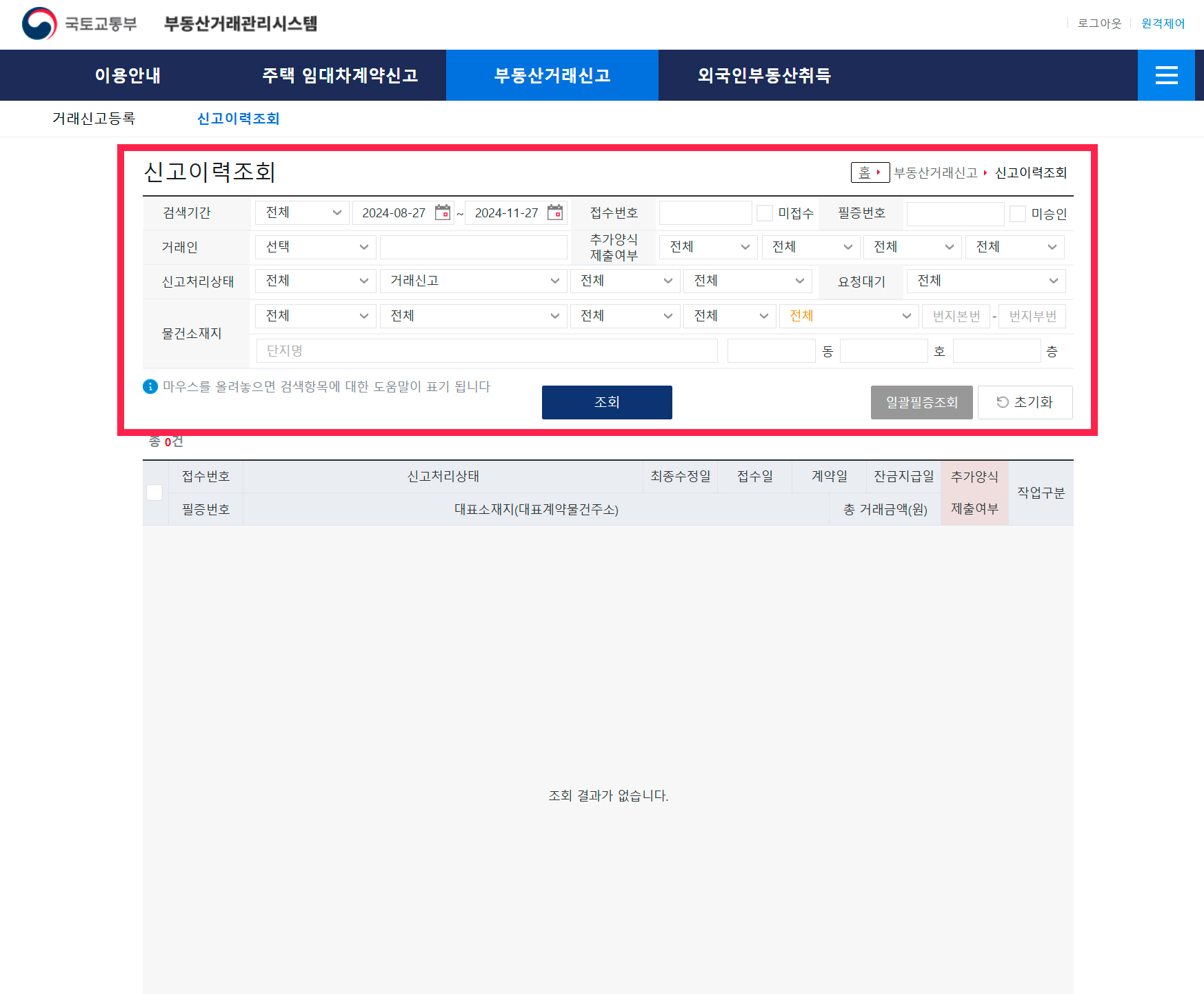 신고이력조회에서 항목을 입력하면 아래쪽에 해당 거래가 뜬답니다.