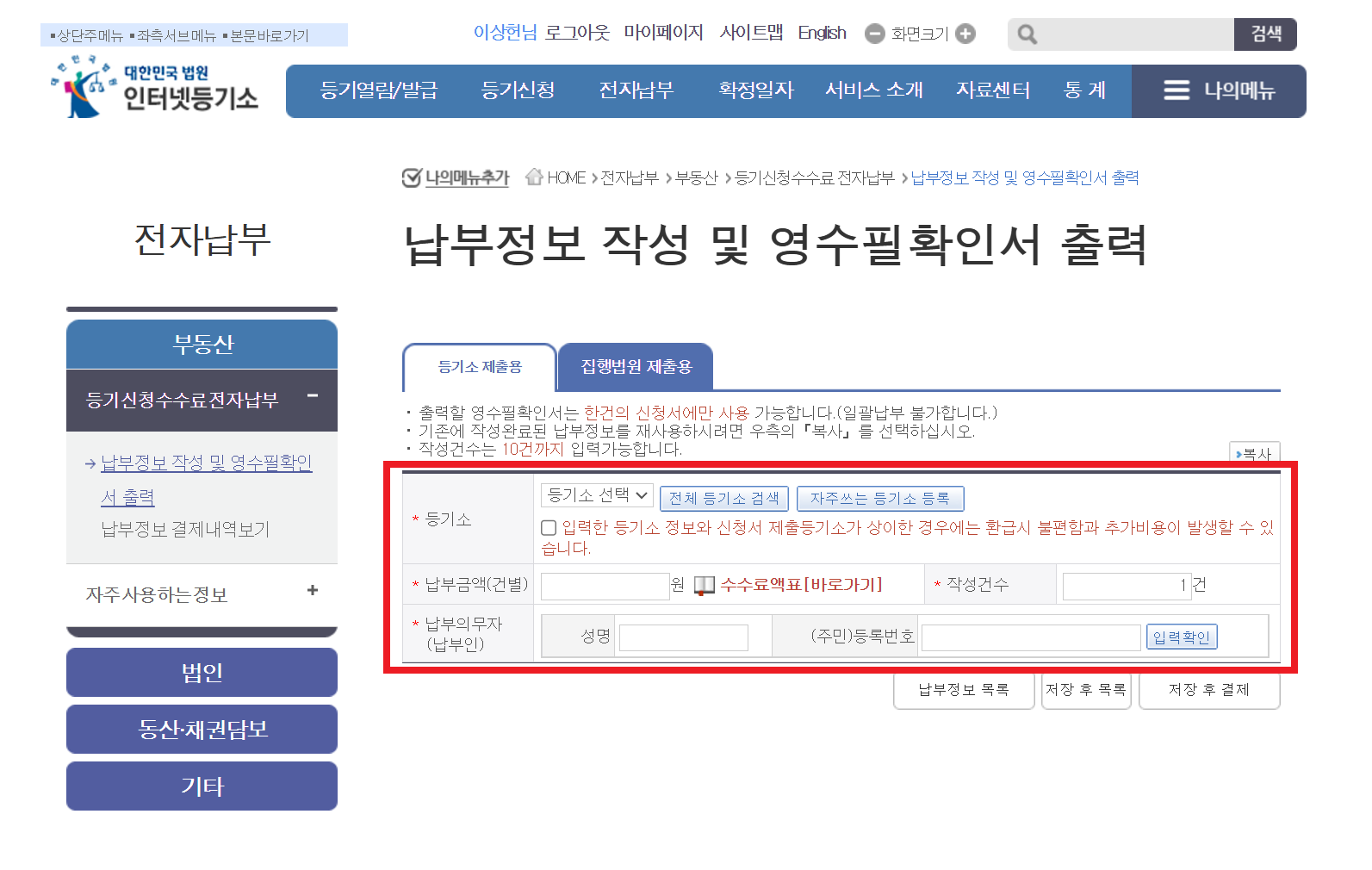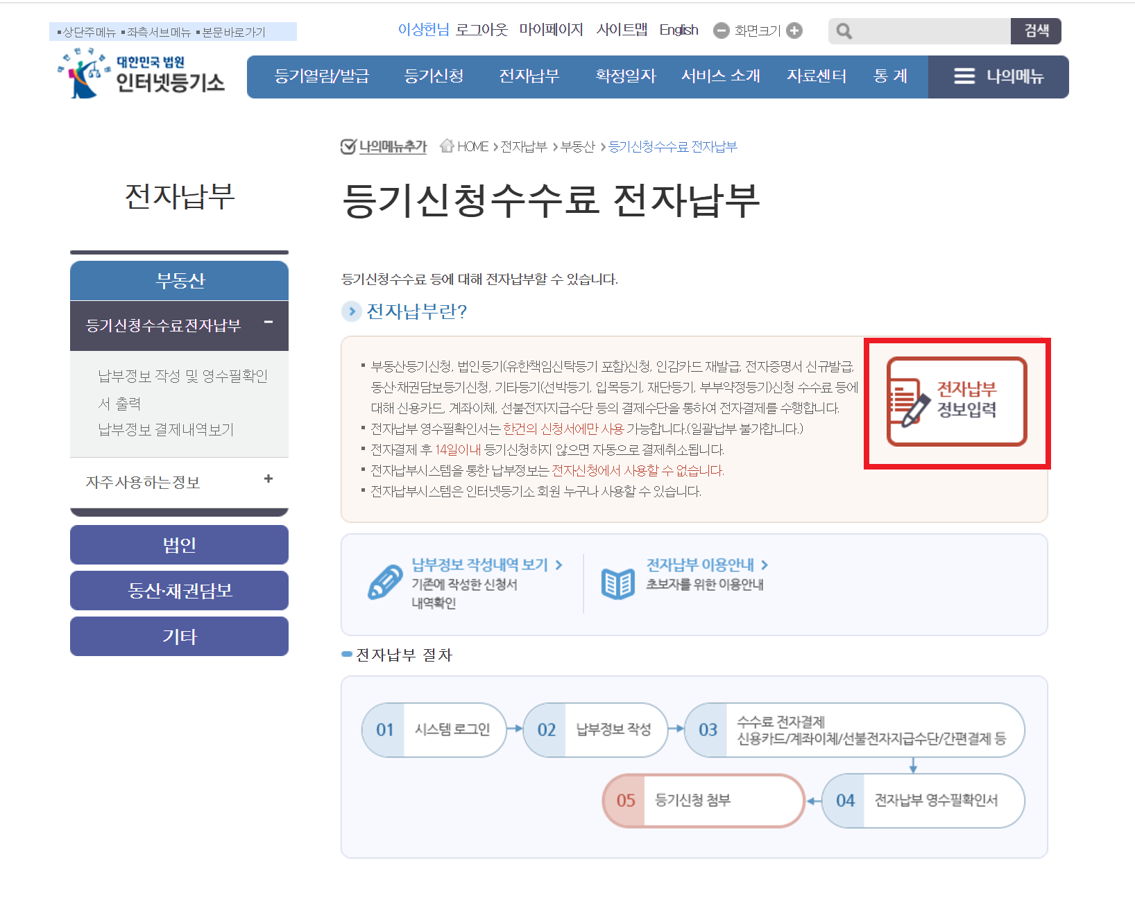 인터넷등기소에 접속해서 로그인 후 전자납부 메뉴를 클릭해 주세요.