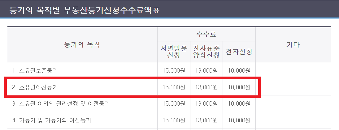 소유권이전등기 납부금액은 서면방문신청 시 15,000원이고 전자표준양식(이폼) 신청 시 13,000원입니다. 서류를 준비해서 직접 등기소에 방문할 예정이어서 15,000원을 결제했답니다.