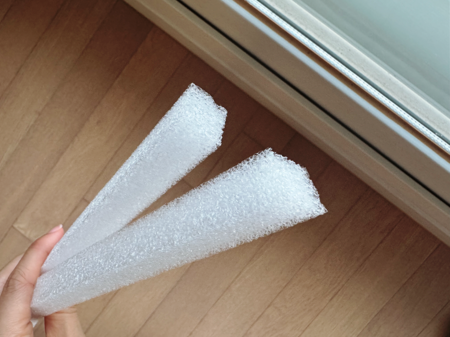 바깥 창문과 안쪽 창문 사이인데 비어있는 저 공간 보이시나요? 저 사이로 바람이 쓩쓩~ 샤시 틈마다 백업제를 꾹꾹 눌러서 끼워줬습니다. 조금 넓은 틈에는 두 개를 겹쳐서 끼워주었답니다.