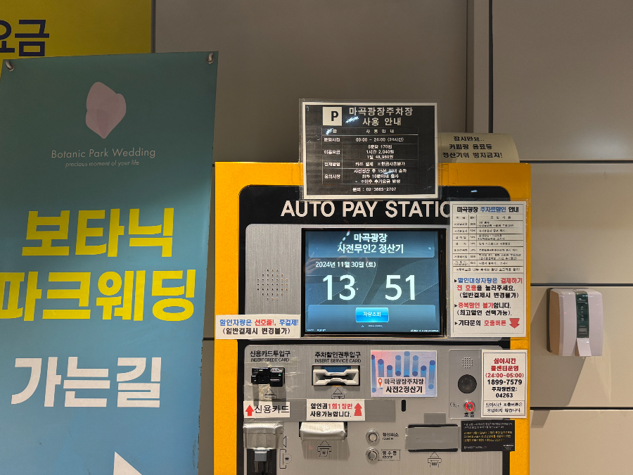 마곡광장주차장은 24시간 운영되고 이용료는 5분당 170원, 1시간 2,040원, 1일 48,960원입니다. 현금 사용은 불가하고 카드 결제만 가능하다고 되어 있습니다. 공영주차장이라 각종 할인도 적용되는데요. 성실납세자 100%, 국가유공자 80%, 장애인 80%, 경차 50%, 5.18 유공자 50%, 저공해차량 50%, 다둥이(2자녀 이상) 50% 할인이 됩니다. 성실납세자 100% 할인이라니.. 무료 아닌가요? 주차료 할인은 결제하기 전 호출 버튼을 눌러야 합니다. 결제 후에는 할인 소급 적용이 안 된다고 하니 꼭 확인하고 결제하세요.
