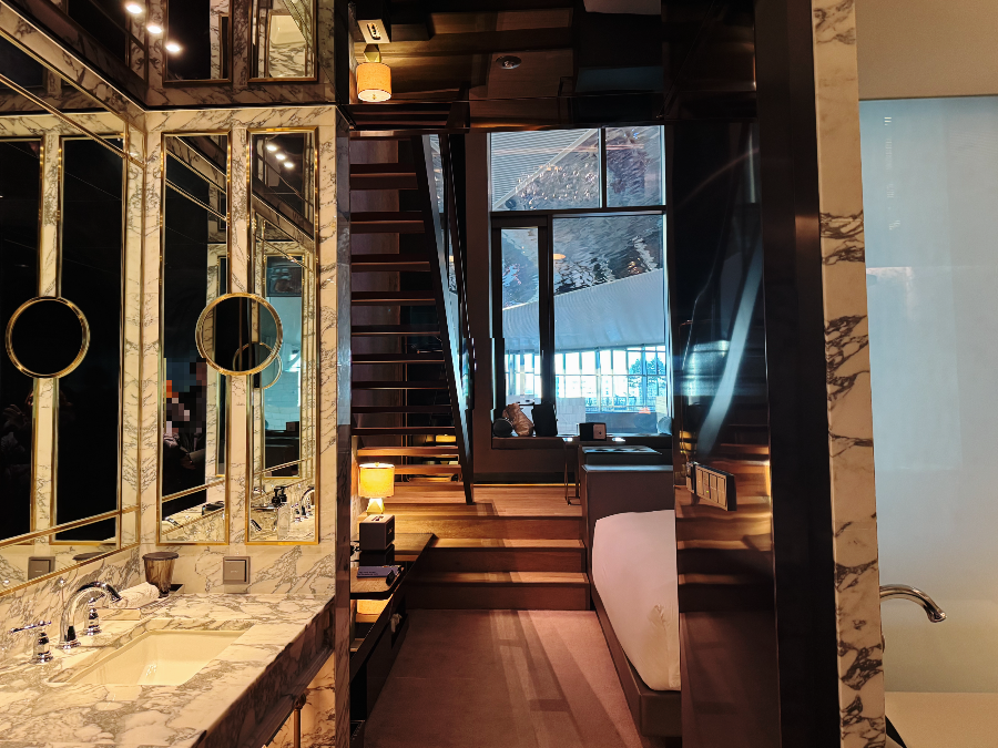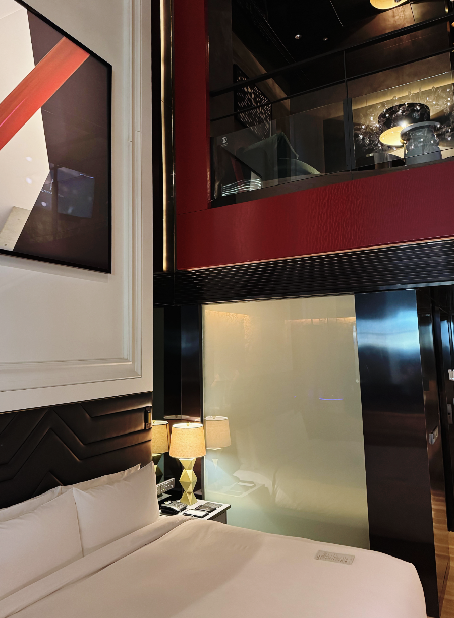 듀플렉스 스위트 객실은 복층구조되어 있어 2층에도 공간이 있습니다. 천장이 높아 개방감이 좋았는데요. 공간활용이 잘 되어있고 조명도 너무 이뻤답니다. 킹사이즈 침대는 넓고 폭신해서 잠을 푹 잘 잤답니다.