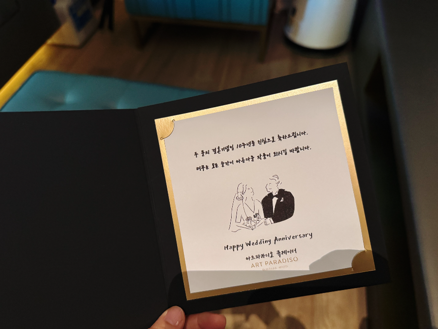 결혼기념일이어서 방문한다고 했었는데 담당 큐레이터분이 이렇게 카드를 준비해 주셨어요~ 아트 파라디소라는 호텔 이름처럼 직원분들도 큐레이터라고 하는 것 같습니다. 웰컴푸드인 초콜릿도 맛있게 먹었답니다.