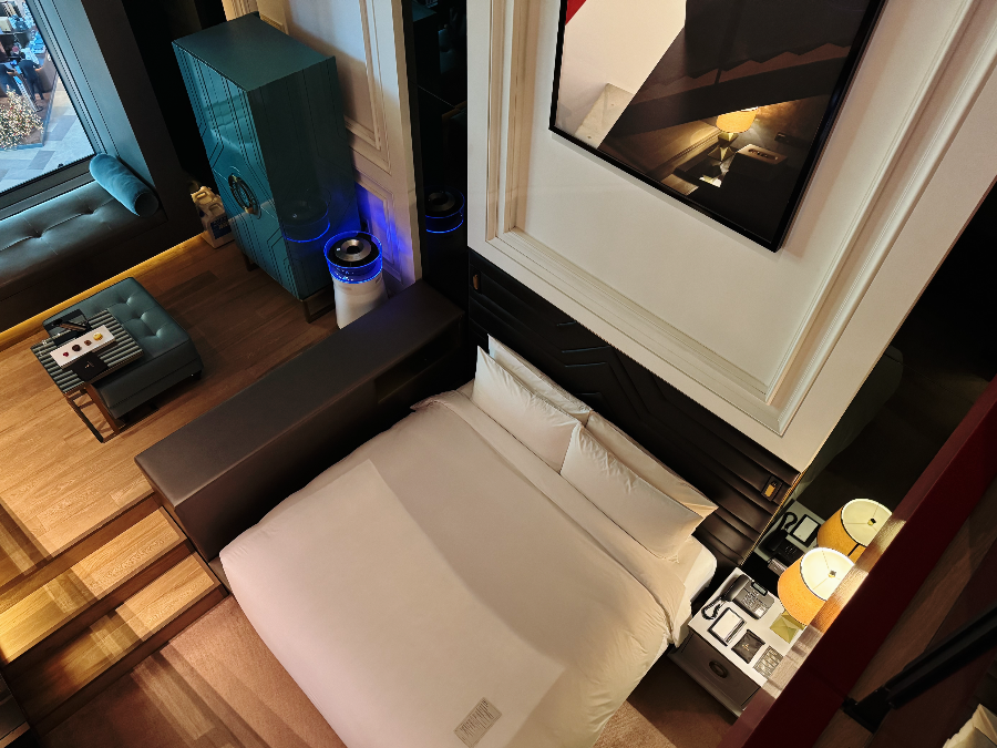 듀플렉스 스위트 객실은 복층구조되어 있어 2층에도 공간이 있습니다. 천장이 높아 개방감이 좋았는데요. 공간활용이 잘 되어있고 조명도 너무 이뻤답니다. 킹사이즈 침대는 넓고 폭신해서 잠을 푹 잘 잤답니다.