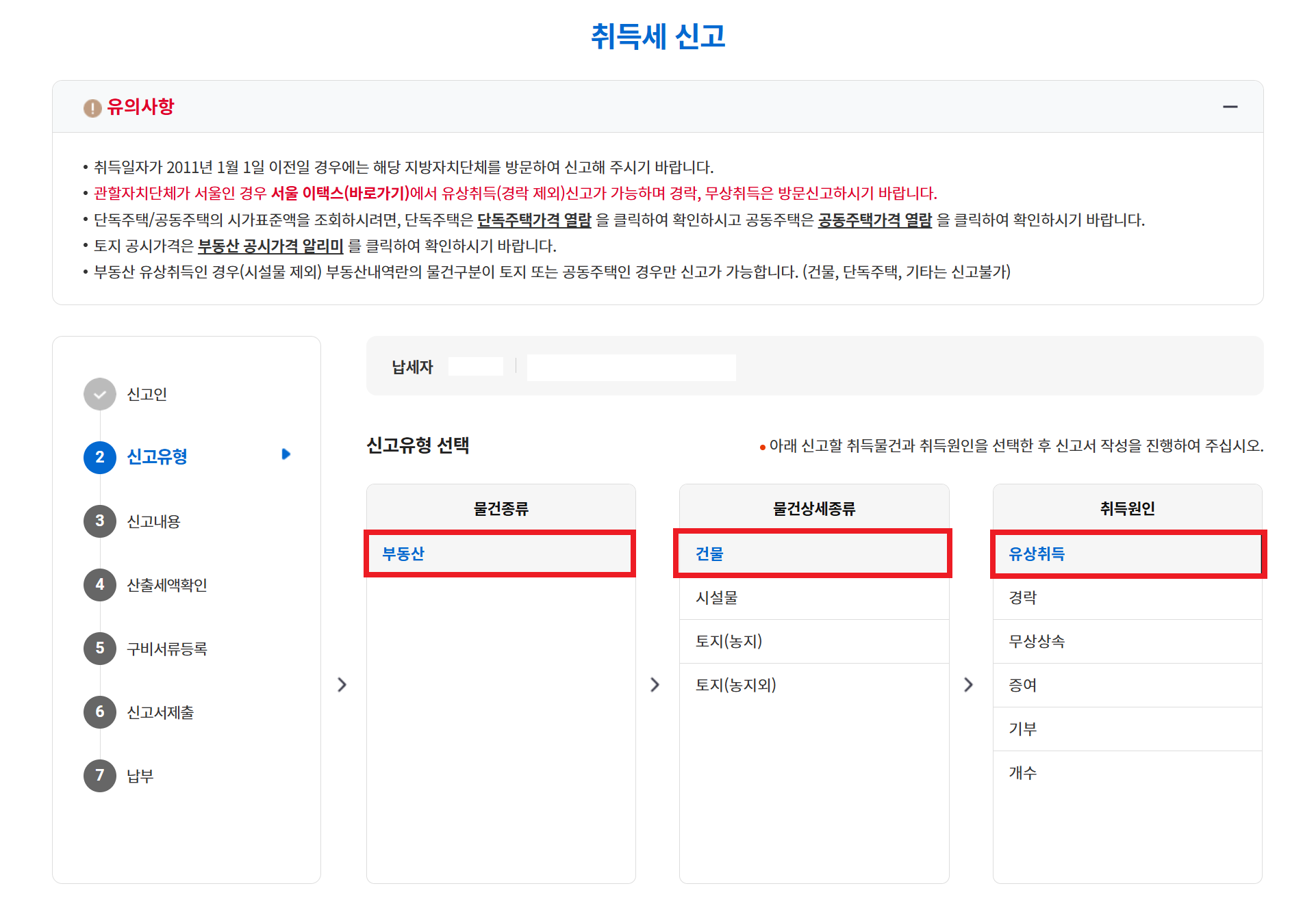 유상취득, 경락, 무상상속, 증여, 기부, 개수 중에서 해당하는 취득원인을 선택하면 됩니다.
