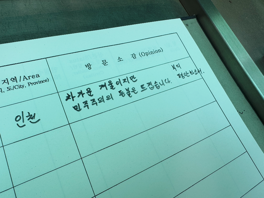 참배를 하고 돌아 나오는 길, 방명록에 남편이 남긴 글을 보고 남편의 심정이 전해졌는데요. 아마도 지금 우리 모두의 심정이지 않을까 생각합니다.