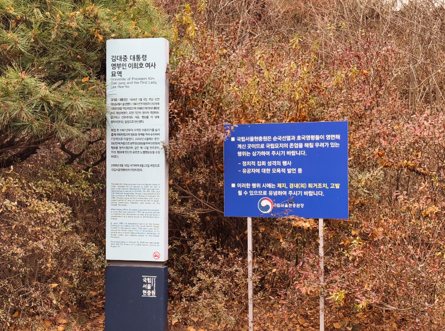 김대중 대통령님의 묘소는 오르막길 중간 정도에 위치해 있습니다. 영부인 이희호 여사님도 김대중 대통령님 곁에 안장되어 두 분이 함께 계시답니다.