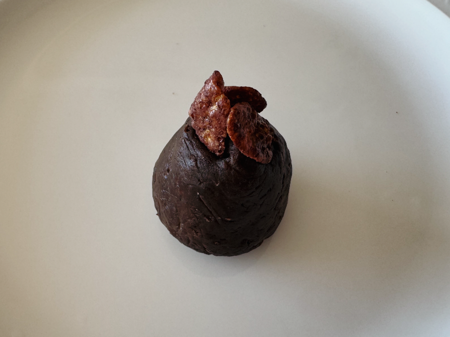 봉지에서 꺼낸 초코덩어리를 물방울모양으로 만들어주세요. 이 초코덩어리가 몸통입니다. 여기에 콘푸로스트를 꽂아주면 솔방울이 된답니다~