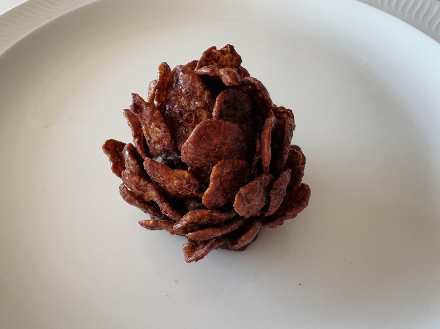 초코덩어리를 접시 위에 놓고 돌려가면서 콘푸로스트를 하나씩 꽂아주세요.