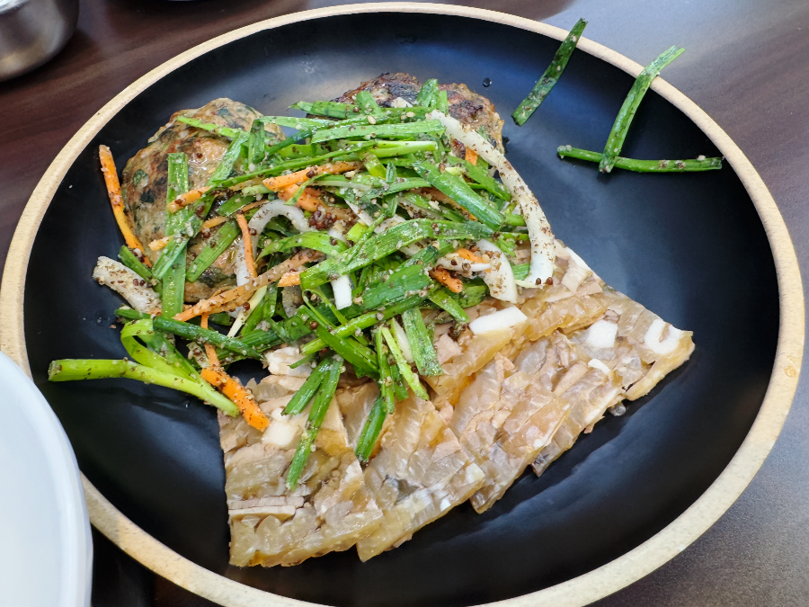 약돌 돼지 한상에는 떡갈비, 편육이 나오고 더덕 약돌 돼지 한상에는 더덕과 떡갈비가 나옵니다. 더덕 약돌 돼지 한상에는 원래 편육이 안 들어가는데 맛만 보라고 몇 점 같이 얹었다고 이야기해 주셨답니다. 떡갈비는 크기는 조금 작은데 도톰하고 간이 세지 않아 좋았습니다. 떡갈비 위에 올려져 있는 부추가 정말 맛있습니다. 들깨소스가 버무려져 있어 고소하고 향긋하고 달콤합니다. 편육도 한 점 먹어보고 깜짝 놀랐는데요. 일반적인 편육과는 다른 특이한 맛인데 맛있습니다. 매콤한 더덕도 떡갈비와 잘 어울려서 맛있게 먹었답니다.