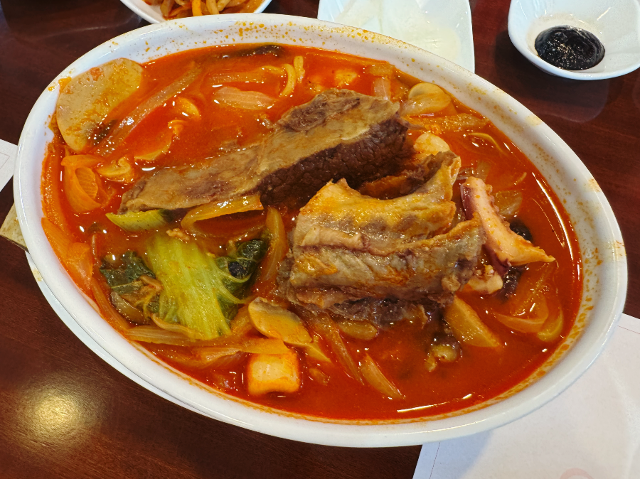 부산에서 온 친구는 왕갈비짬뽕이라고 해서 커다란 그릇에 나오는 줄 알고 잔뜩 기대했다가 생각보다 그릇이 작아서 처음엔 약간 실망했다고 합니다. 그런데 이름처럼 진짜 왕갈비가 들어있고 고기가 부드럽고 질기지 않아 맛있게 잘 먹었다고 했답니다. 친구는 국물도 깔끔하고 맛있다며 밥을 부르는 국물이라고 하면서 공깃밥을 추가해서 먹었습니다. 친구말처럼 국물이 맛있어서 그냥 짬뽕도 웬만한 동네 짬뽕보다 훨씬 맛있습니다. 왕갈비짬뽕이 커서 부담스럽다면 짬뽕으로 드셔도 좋지만 그래도 한 번쯤은 왕갈비짬뽕 드셔보세요. 갈비가 실하고 국물이 맛있습니다~