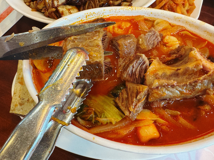 자~ 이제 가위와 집게로 갈빗살을 잘 발라서 국물과 함께 한입 가득 맛있게 드시면 됩니다~ 왕갈비가 들어있어서 국물이 느끼할 것 같은데 해산물이 많이 들어있어서 전혀 느끼하지 않고 시원하답니다.
