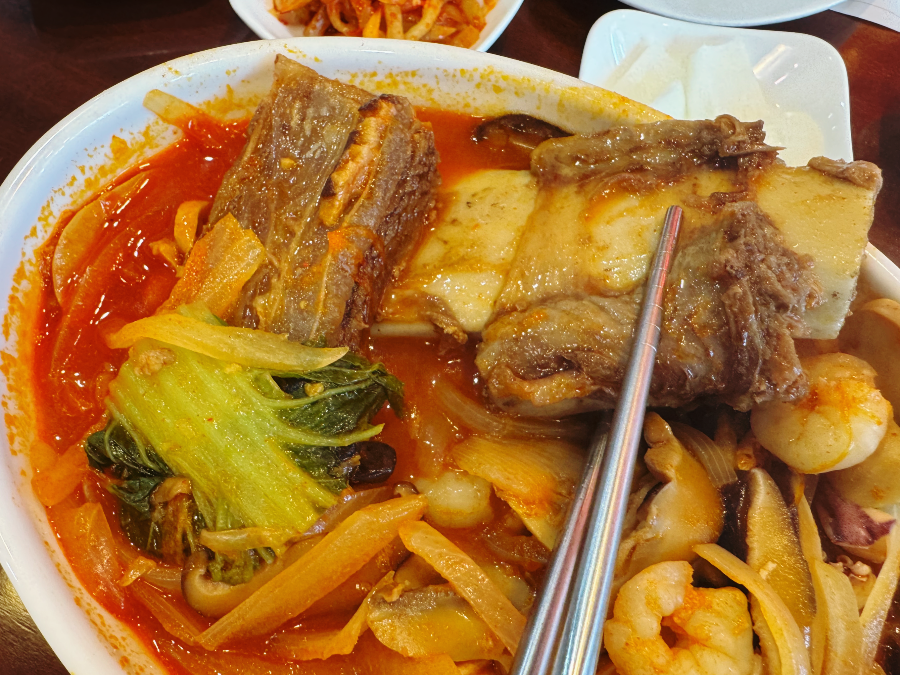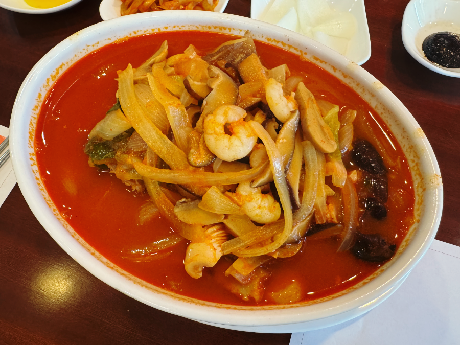 부산에서 온 친구는 왕갈비짬뽕이라고 해서 커다란 그릇에 나오는 줄 알고 잔뜩 기대했다가 생각보다 그릇이 작아서 처음엔 약간 실망했다고 합니다. 그런데 이름처럼 진짜 왕갈비가 들어있고 고기가 부드럽고 질기지 않아 맛있게 잘 먹었다고 했답니다. 친구는 국물도 깔끔하고 맛있다며 밥을 부르는 국물이라고 하면서 공깃밥을 추가해서 먹었습니다. 친구말처럼 국물이 맛있어서 그냥 짬뽕도 웬만한 동네 짬뽕보다 훨씬 맛있습니다. 왕갈비짬뽕이 커서 부담스럽다면 짬뽕으로 드셔도 좋지만 그래도 한 번쯤은 왕갈비짬뽕 드셔보세요. 갈비가 실하고 국물이 맛있습니다~