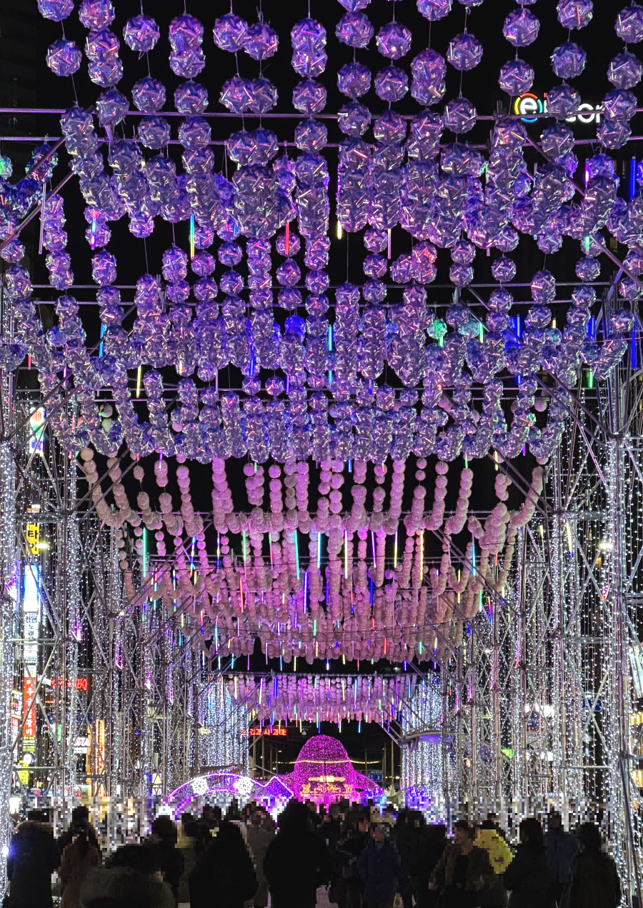 해운대역에서 해운대해수욕장으로 오는 길인 구남로에도 여러 가지 반짝이는 여러 가지 조형물이 설치되어 있습니다. 머리 위에는 물결처럼 흔들리는 이쁜 조명들이 달려있고 곳곳에 트리와 눈꽃, 달, 고래 조형물까지 다양한 포토스팟이 있답니다.