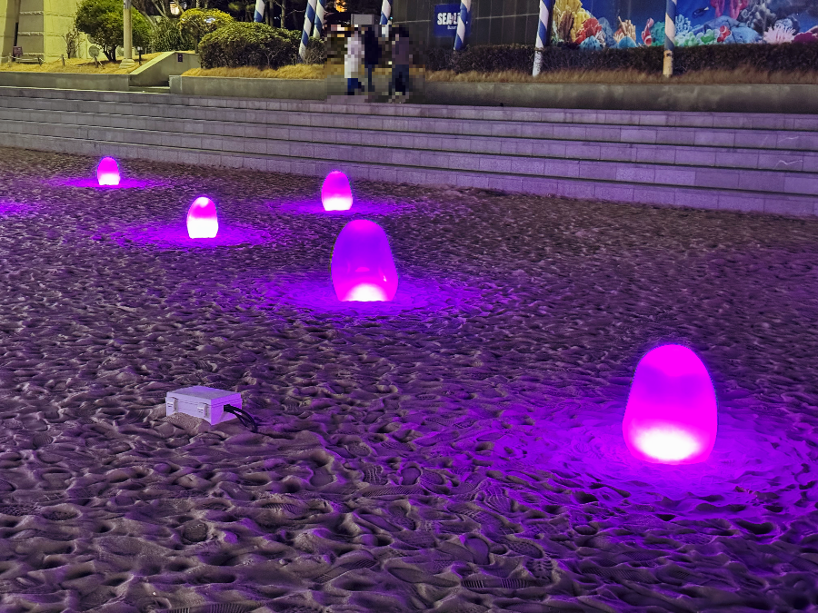 해운대해수욕장 백사장과 해운대역에서 해운대해수욕장으로 오는 길인 구남로에는 반짝 반짝이는 여러 가지 조형물과 미디어아트, 체험형 시설물들이 설치되어 있습니다. 점등시간이 오후 5시 30분부터 자정까지여서 늦은 시간에도 많은 사람들이 있었답니다.