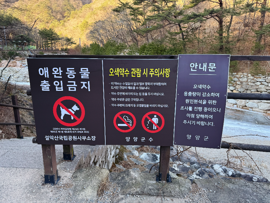오색약수 용출량이 감소하여 원인분석을 위한 조사를 진행 중이라는 안내문과 수질검사결과 일부 항목이 부적합하여 마시면 건강에 해로울 수 있다는 주의사항이 붙어있었는데요. 약수를 마시고 이상이 있으면 본인 책임이라는 뜻인 것 같습니다.