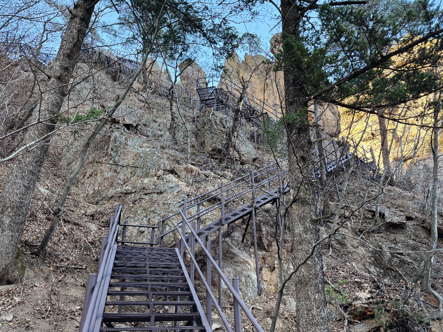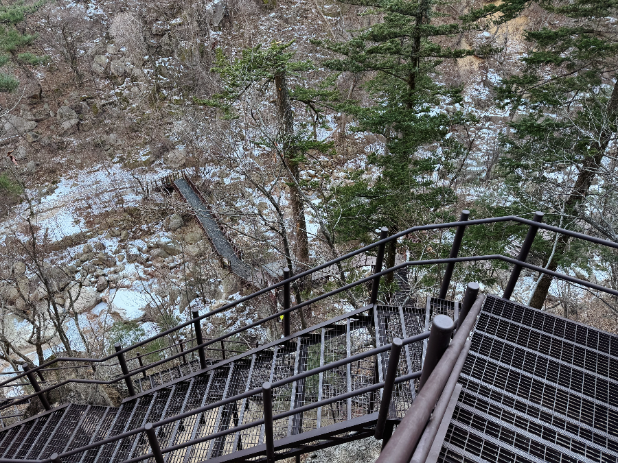 용소폭포로 가는 길로 돌아서 서서 보니... 뜨아아 아! 저건 뭐죠? 계.... 단....?? 사진으로 보니 그리 높아 보이진 않는데 실제로 보면 어마어마한 높이의 계단이랍니다. 이 계단을 올라가서 내려가야지만 용소폭포에 갈 수 있습니다..