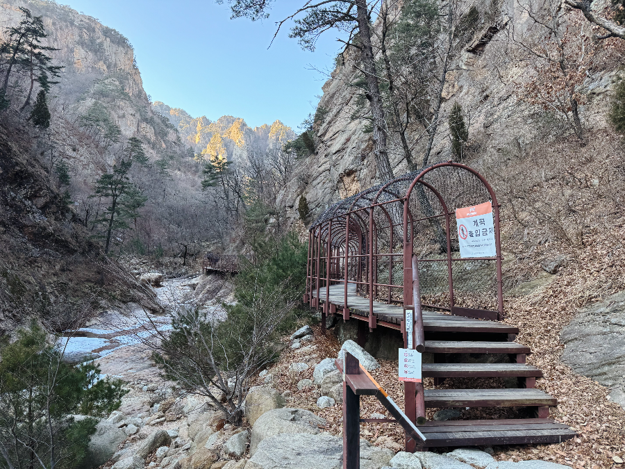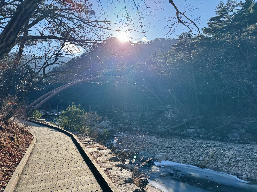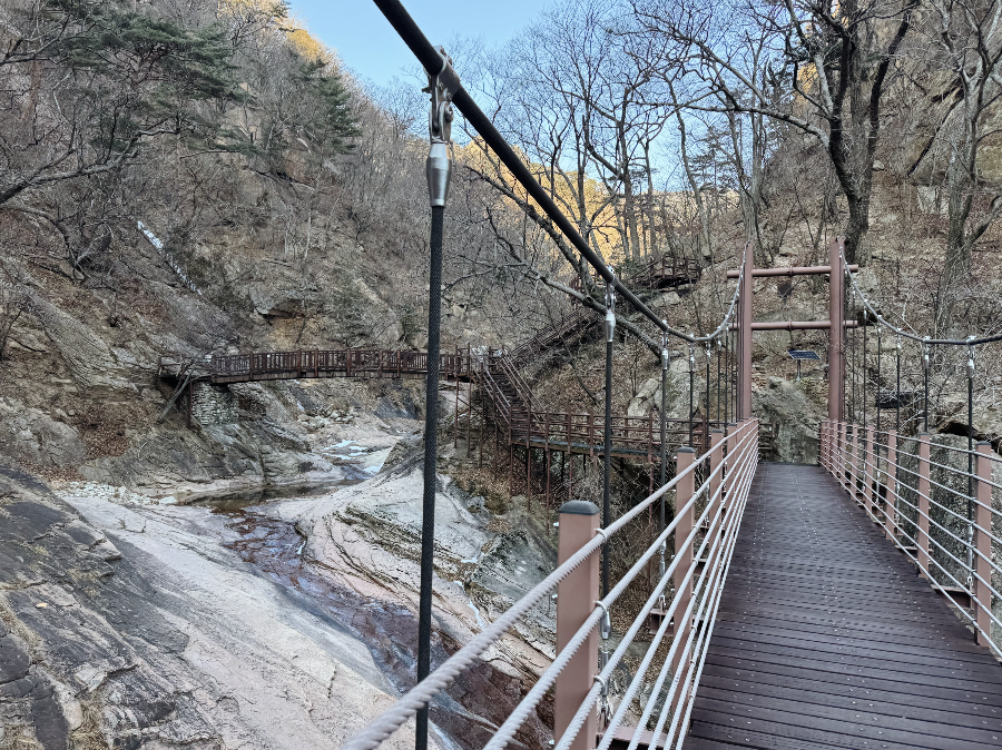성국사를 기점으로 데크가 깔려있는 곳도 있지만 계단도 있고 돌길도 있어 본격적인 탐방로가 시작된답니다. 가벼운 산책정도만 하고 싶으시다면 성국사까지만 탐방하고 내려가셔도 좋을 것 같습니다. 하지만 주전골의 기암괴석은 이제부터 볼 수 있답니다. 선녀탕은 주전골 탐방로의 중간 기점입니다. 선녀탕까지는 길이 오르락내리락하지만 그렇게 험하지 않아서 기암괴석을 구경하면서 가기 좋습니다. 올라가는 길 내내 앙상한 나뭇가지와 얼어있어 에메랄드색인지 확인이 불가한 강물만 보고 있다가 보게 된 기. 암. 괴. 석! 먹으로 그린 바위가 그대로 눈앞에 나타난 것 같은 모습에 깜짝 놀라실 거예요~