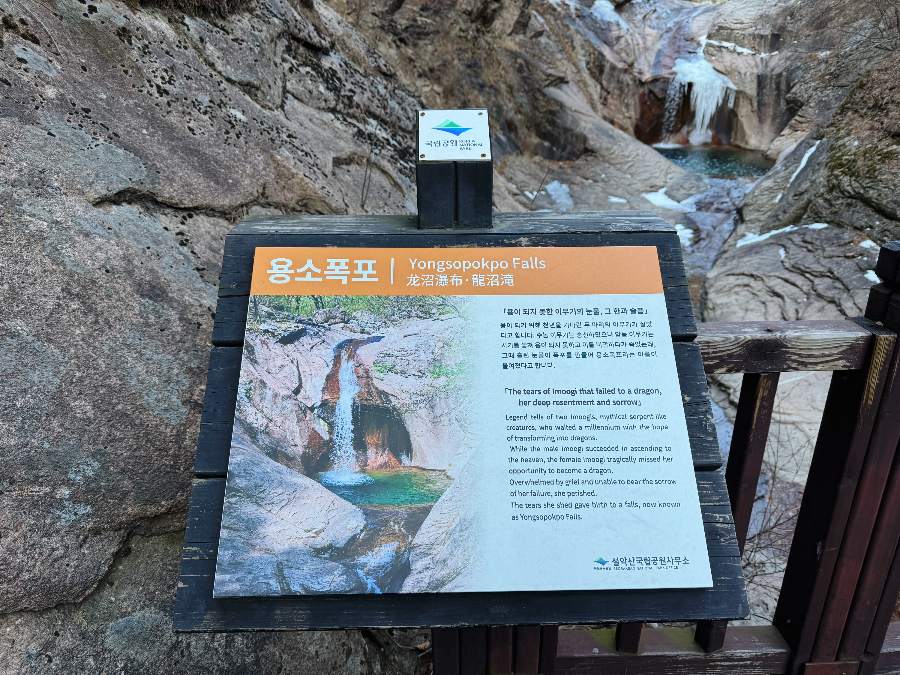 안내판에 따르면 용이 되지 못한 이무기의 눈물이 폭포를 만들었는데 그것이 바로 용소폭포라고 합니다. 기암괴석 사이에서 떨어지는 크고 멋진 폭포를 상상하면서 왔기에.. 용소폭포를 보면서 소가 작을 소가 아니냐며 폭포가 맞냐고 의심했답니다.