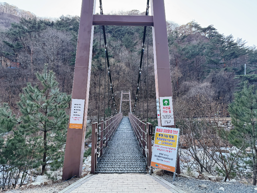 오색약수 위쪽에 있는 약수출렁교가 주전골 자연관찰로, 주전골 코스의 시작입니다. 출렁교는 짧지만 정말 출렁출렁거려서 건너는 동안 재미있었답니다. 사진도 한 컷 찍고 용소 폭포로 고고씽~