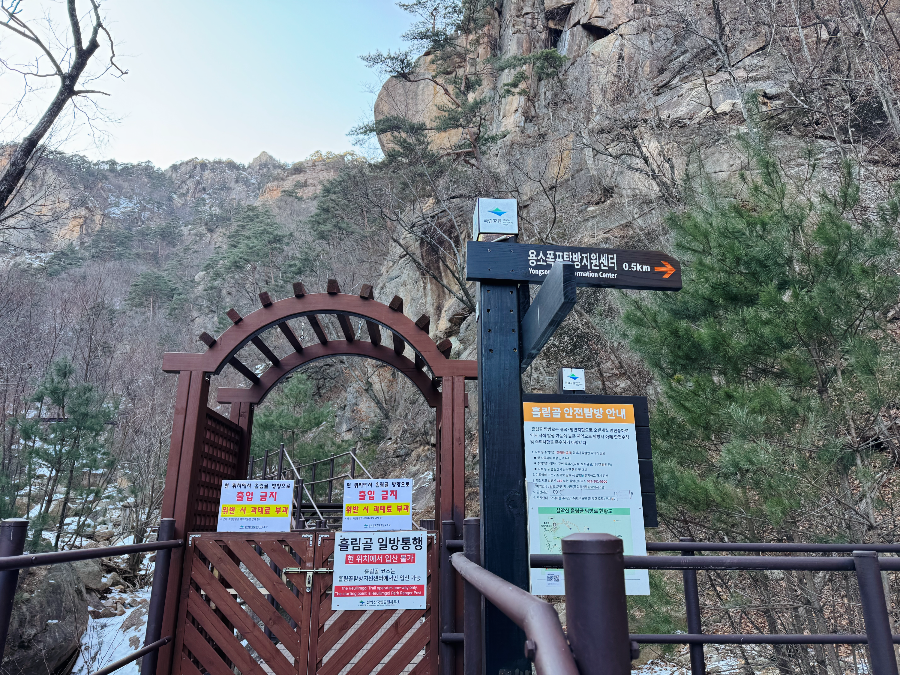 계속 가다 보면 두 갈래 길로 나뉘는 곳이 나옵니다. 바로 용소삼거리입니다. 용소폭포로 가는 길과 흘림골로 가는 길로 나누어지는데요. 흘림골 코스는 일방통행이라서 현 위치에서는 출입 금지라고 되어 있습니다.