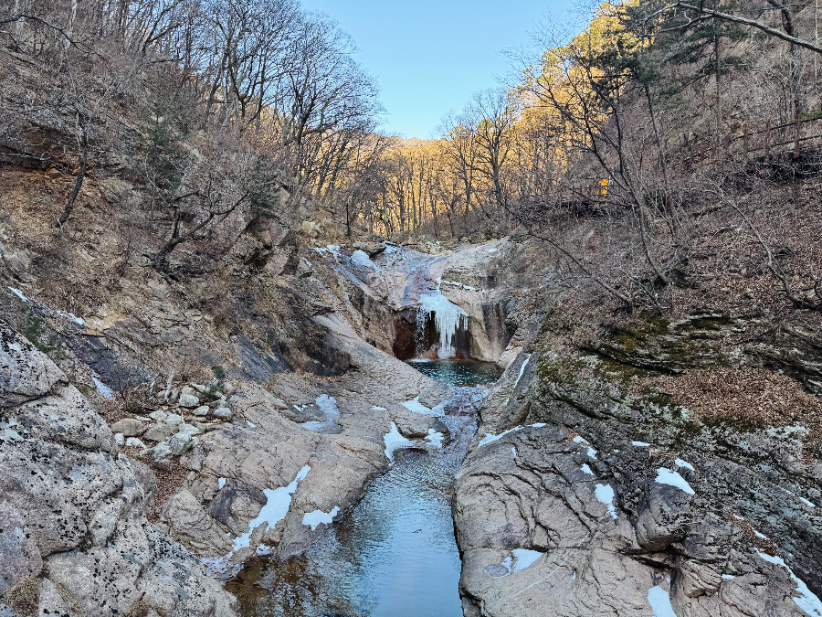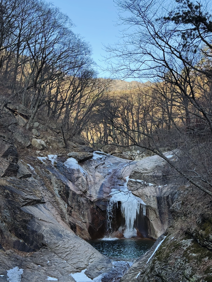 폭포가 작기는 했지만 물이 정말 맑고 에메랄드 색이었는데요. 주변 풍경과 함께 어우러지면 장관이었을 텐데.. 겨울이라 앙상한 나뭇가지와 얼어서 고드름이 된 폭포를 보면서 조금 많이 아쉬웠답니다. 하필 해도 산 너머로 지나가버려서 폭포가 쓸쓸해 보였답니다.